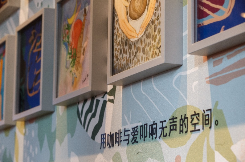 進(jìn)入門店,除了熟悉的美人魚標(biāo)識(shí),店內(nèi)隨處可見融合了手語元素和咖啡文化的藝術(shù)作品。“用咖啡與愛叩響無聲的空間”,“這是一家安靜的星巴克”“用心聆聽愛的聲音”這些簡(jiǎn)單的文字中透露出星巴克手語門店與聽障群體的緊密連結(jié)。由藝術(shù)家和天使伙伴共同創(chuàng)作完成的組合墻畫,通過星巴克、咖啡、愛與成都元素等多個(gè)主題表達(dá)了伙伴們對(duì)美好生活的理解和對(duì)夢(mèng)想的勇敢追求。