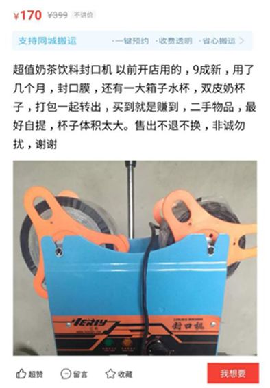 從二手網(wǎng)站上看來,奶茶店二手設(shè)備八九成新的價(jià)位大概都是原價(jià)的對(duì)折,高一點(diǎn)的也是7折左右。