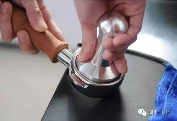 接粉完成后,先在手柄支架上輕輕往下磕一到兩次手柄,使粉碗中的粉堆更加密實。是一種布粉前的輔助動作。這種方式能使咖啡粉堆更加密實,也有助于增加粉碗中可以容納的粉量。輕磕手柄時一定注意要直上直下,并且每一次操作時力度和次數(shù)都要保持一致,避免造成額外的變量,否則會給萃取結(jié)果的評估帶來干擾。點評:這種方法可以有效地消除上下粉層中的大“縫隙”,使得上下層的咖啡粉密度接近平均。這是真實有效的布粉法。4拍擊布粉法: