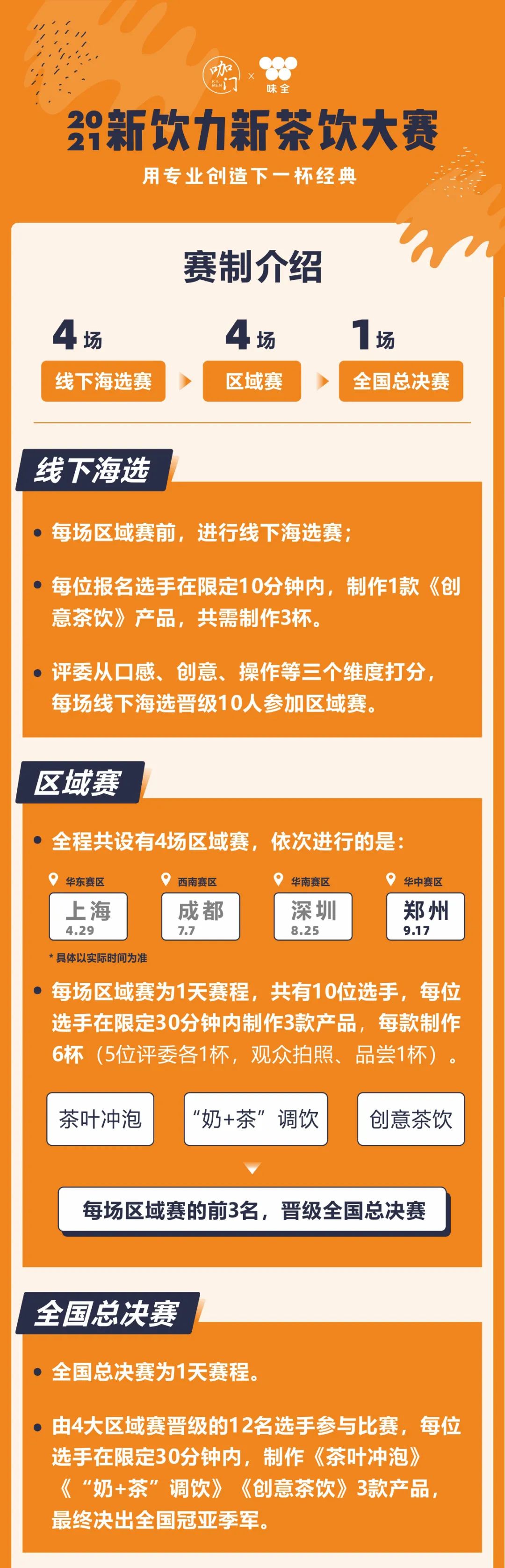9月17日,咖門主辦、味全冠名的2021新飲力新茶飲大賽華中區(qū)域賽,將在鄭州開啟。