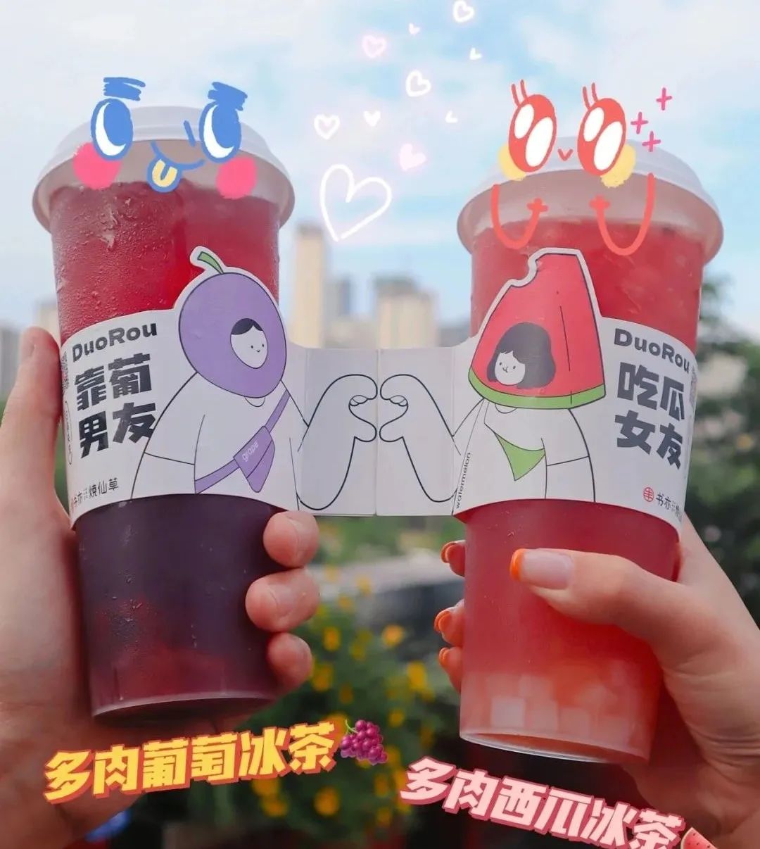 多肉葡萄冰茶的杯套上寫著“靠葡男友”、多肉西瓜冰茶的杯套上寫著“吃瓜女友”,兩個(gè)杯套上分別有兩個(gè)可愛的簡筆畫小人,連接著兩個(gè)杯套的,是兩個(gè)小人伸手做的愛心手勢。