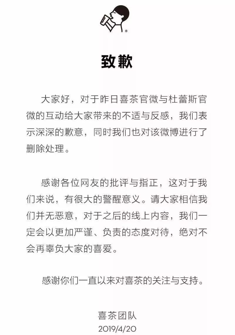 喜茶與杜蕾斯的互動,現已刪除處理。選在4月19日,取的是英文419諧音,即for one night(four one nine),也就是“一夜情”的意思。文案“今夜,一滴都不許?!薄嗦懵愕膶⒛躺w茶比作“精液”。網友評論“無法直視奶蓋茶了”、“喝喜茶的時候會有心理陰影”。事件發(fā)酵到昨天,一度上了微博熱搜。很快,喜茶和杜蕾斯都刪掉了相關的微博與互動。喜茶在微博發(fā)出致歉聲明,稱“有很大的警醒意義,對于之后上線的內容,會以更加嚴謹、負責的態(tài)度對待。”