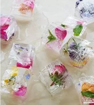 冰塊當然也能玩出花樣,在冰格里倒一半水,把干凈的可食用花瓣放進去,凍到半程再填滿水,你的“飲品造型師”鮮花冰塊就做好了。