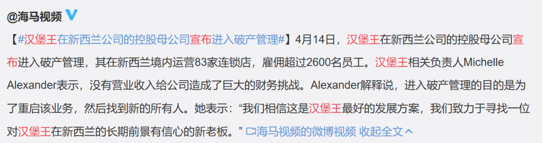 隨后,漢堡王中國緊急回應(yīng)稱,網(wǎng)傳消息不實,I'm fine thank you and you。(向破產(chǎn)公司)申請專業(yè)托管的是漢堡王在新西蘭的加盟商,漢堡王(中國)業(yè)務(wù)不受影響。據(jù)海馬視頻報道,漢堡王相關(guān)負責(zé)人Michelle Alexander表示,沒有營業(yè)收入給公司造成了巨大的財務(wù)挑戰(zhàn)。Alexander解釋說,進入破產(chǎn)管理的目的是為了重啟該業(yè)務(wù),然后找到新的所有人。她表示:“我們相信這是漢堡王最好的發(fā)展方案,我們致力于尋找一位對漢堡王在新西蘭的長期前景有信心的新老板。”
