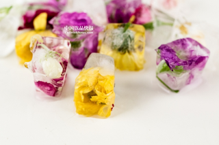 1.將干凈的紫羅蘭、薔薇、茉莉花、雛菊、薄荷葉以及其他可食用花朵(三色堇、旱金蓮、琉璃苣、菜心花、金盞菊)放在冰格里,注入礦泉水;