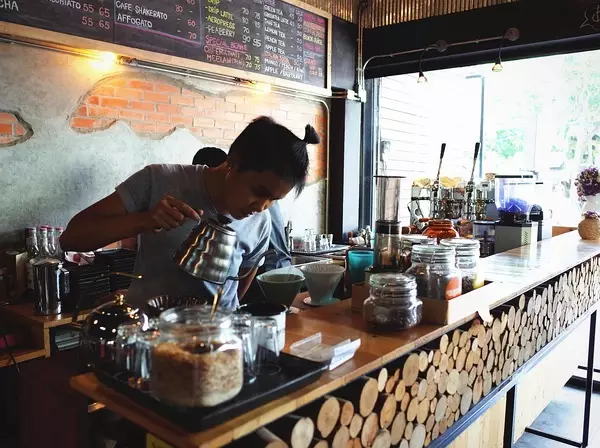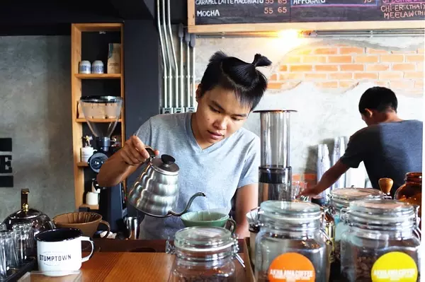 倒是清邁古城和寧曼路上集中了好多家高品質(zhì)的咖啡館,小小的一間門面,配色逃不出黑、白、原木色,以及閃閃發(fā)光的不銹鋼銀。其中總有名店員是一眼看不出性別的,多為很帥的姑娘,男生反倒是走路也陰柔地扭著腰肢,不管這些,只要手里能做出一杯驚艷的咖啡,隨便是gay啊拉拉異裝癖人妖都行,有什么關(guān)系嘛,瘋狂地兼容并包這才是泰國嘛。