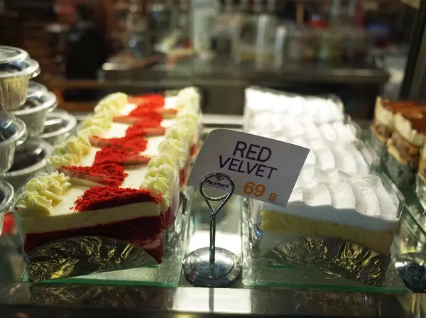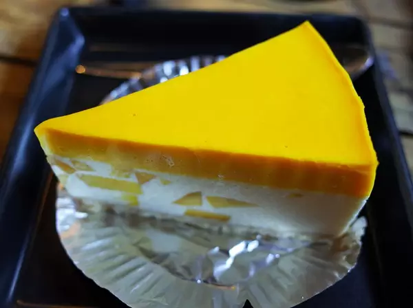 旁邊兩位姑娘吃完兩片蛋糕又點(diǎn)兩片,看得我蠢蠢欲動,要了塊芒果芝士蛋糕,下層的果肉倒是新鮮的,就是上層的芒果醬口味有點(diǎn)失真,不知道是泰國人欣賞的風(fēng)格呢還是怎樣。