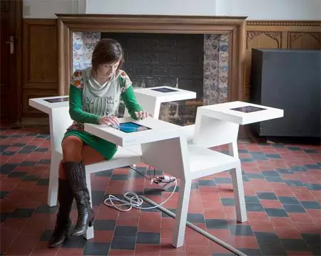 這張桌子由四個(gè)椅子組成,每個(gè)椅背上都有一個(gè)ipad,可供四人同時(shí)使用。