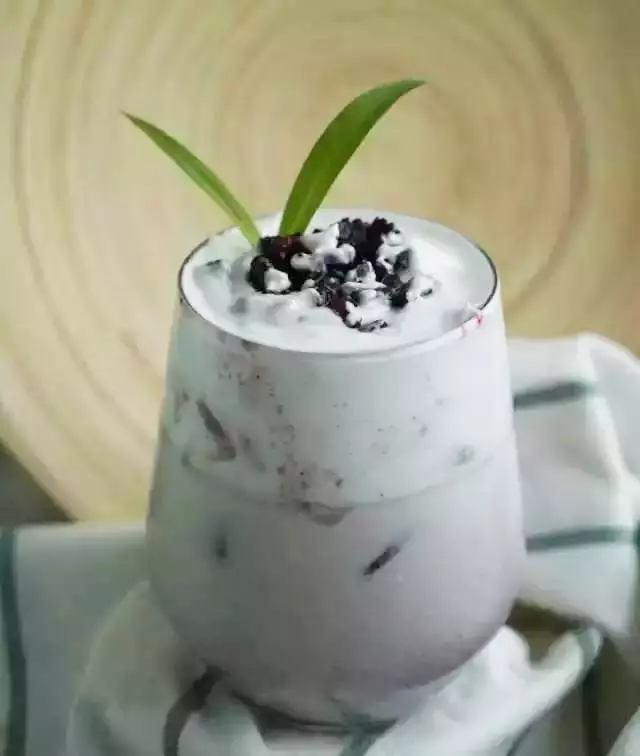 金晶花 20g薏仁紫米昔粉 10g奶蓋 30ml紫米 10g焦糖糖漿 適量熱水 150ml冰塊 200g