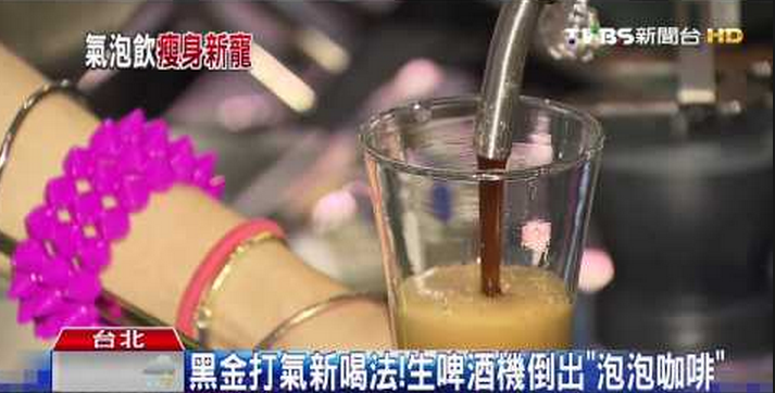 氣泡從咖啡中慢慢浮出來,上頭形成象是啤酒泡泡一樣的咖啡泡泡,而底部的咖啡逐漸從深褐色轉(zhuǎn)變成琥珀色??Х鹊昀习錕uan:“美國人喜歡啤酒也喜歡咖啡,所以他們就覺得為什么不能把兩個(gè)結(jié)合?!?Kuan是紐約時(shí)裝設(shè)計(jì)師回臺(tái)開咖啡店,也把美國喝咖啡的新趨勢帶回臺(tái)灣,花了2-3個(gè)月研究,烘焙出最適合打進(jìn)氣泡的咖啡配方,但氣泡打進(jìn)咖啡里,還得靜置2-3天。Kuan:“泡沫非常細(xì)致,而且它很持久,也像碳酸飲料泡泡?!?