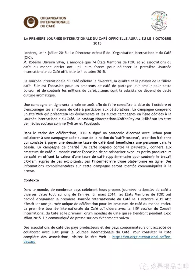 以下譯文摘自世界咖啡組織官方網(wǎng)站,地址為:http://ico.org/international-coffee-day.asp 標(biāo)題:有史以來第一個(gè)世界咖啡節(jié)定于2015年10月1日