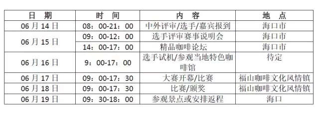 二、參團觀摩備注:大會委托旅行社組團為個人安排前往觀賽。吃住行全部解決!1、行程安排:1)6月16日自行前往指定酒店(海口鑫源溫泉酒店,地址:海南省??谑旋埲A區(qū)海秀路18-8號,電話:4007-889-889)報到入住。(機場大巴終點站海秀路民航賓館下,步行到對面便是。)2)17日早上07:00時叫醒,07:30時用早餐,08:00時前往賽事場地—福山,觀摩賽事,期間可品嘗咖啡師為你精心制作的傳統(tǒng)濃香咖啡及特色點心1次;中午由組委會提供自助午餐,下午賽事結(jié)束后,接回酒店休息。晚上自由活動。3)18日早上07:00時叫醒,07:30時用早餐,08:00時前往賽事場地—福山,觀摩賽事,期間可品嘗咖啡師為你精心制作的濃香咖啡及點心1次;中午由組委會提供自助午餐,下午賽事結(jié)束后接回酒店休息。晚上自由活動。4)19日退房,結(jié)束愉快的行程。2、費用分列(暫按20人報價):注:人數(shù)這個大家不用管,只是旅行社的起團要求。一個人便可報名參團。若不足20人,費用可能略有調(diào)整。1)住宿酒店:??邛卧礈厝频辏?月16—18日3晚,每間房最多含2份中式自助早餐)230元/間、晚×3晚÷2人=345元/人注:客人如需單人住宿,必須提前告知,并另補繳房差345元/人。2)用餐:除早餐外,暫不做正餐用餐安排。(組委會有提供自助午餐)活動期間,組織團員前往著名的福山咖啡館品嘗咖啡師為你精心制作的傳統(tǒng)濃香咖啡及特色點心:自主消費。3)用車(用車行程為??谧∷蘧频辍愂聢龅丶爸苓吇顒?,按20人、17、18日2天用車報價):150元/人;費用合計:523元/人3、報名時間截止時間:2015年6月10日報名詳細(xì)咨詢熱線:海南觀光國旅聯(lián)系人:歐禮德 手機:13707586160QQ號:356752070
