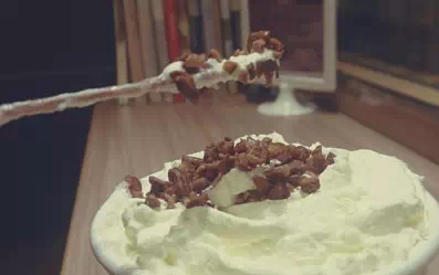 按茶顏的官方講解,喝“幽蘭拿鐵”分三步,一挑、二攪、三喝。挑的是帶碧根果的奶油,吃去2/3后,開始大力攪拌茶與奶油,接著才是喝飲料。如果只是插著吸管直接開喝,一定!一定!一定是難喝得要了命(真的嗎?)。