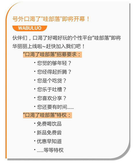 “口渴了”在官方微信平臺公布了“哇部落”即將開幕的信息。這個“哇部落”究竟為何物?從消息上看,貌似一個高級會員交流平臺,而且會有更多的線下的體驗活動(不局限于飲品)。前不久,口渴了就帶領(lǐng)“舌尖刺客挑戰(zhàn)賽”中中獎人員參與了草莓采摘的活動。或許此“部落”會有更多這樣互動的活動推出。