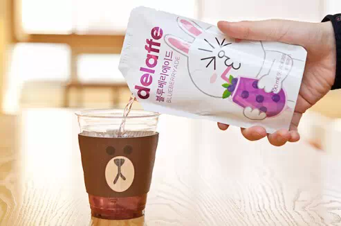 韓國的連鎖便利店CU與“LINE”合作,推出了一系列畫有“LINE”卡通公仔的冷飲。目前這一系列包裝可愛的冷飲正在SNS上成為熱門話題。冷飲僅售1,000韓元,其中包括裝在袋子里的飲品和一杯冰塊。只要將飲料倒入杯中,隨時(shí)就可以喝到?jīng)鏊娘嬃稀?br />
