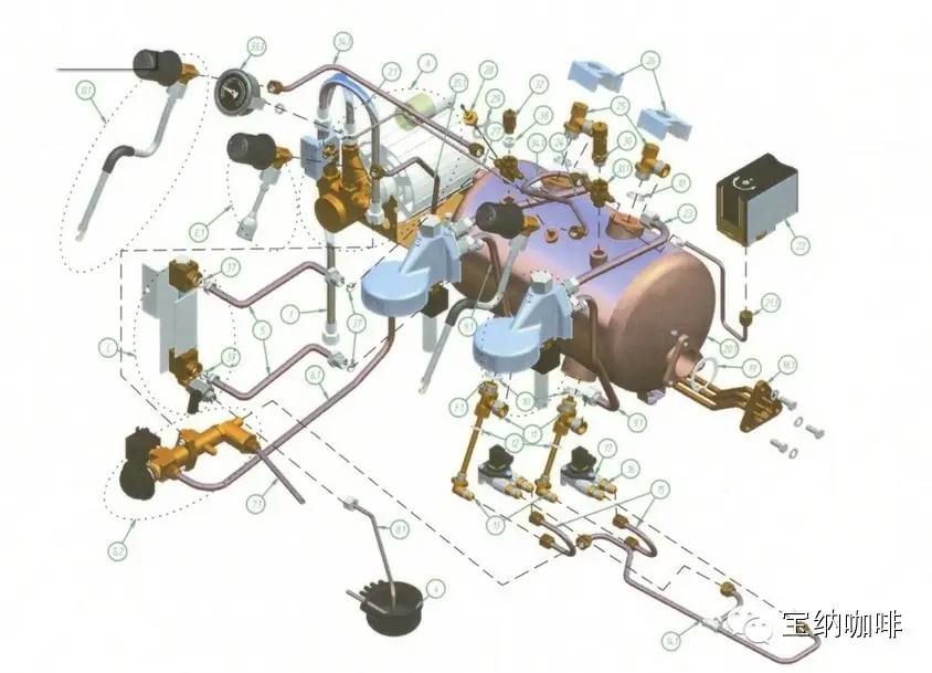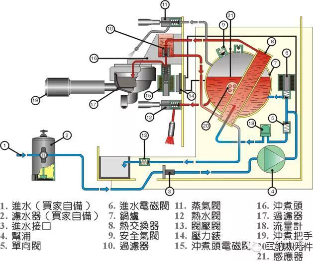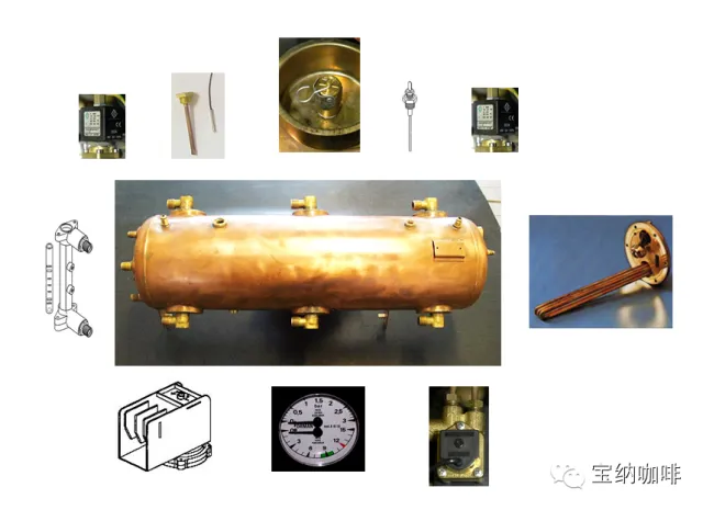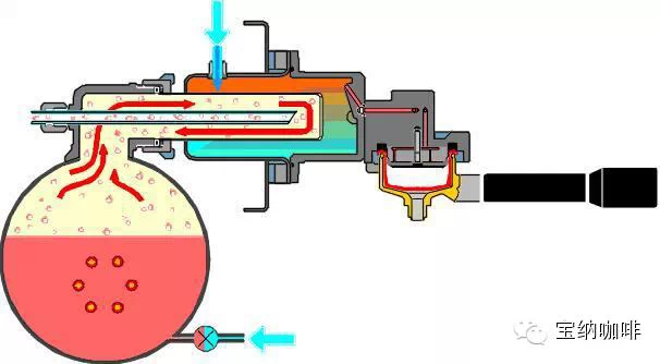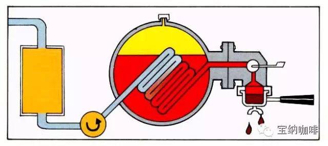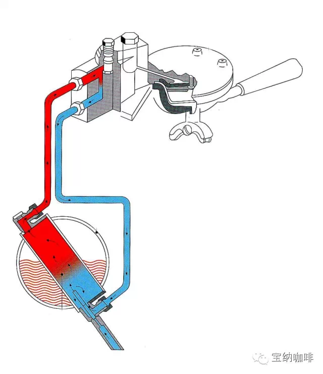 - 1962年之后電子零件的普及化;“熱交換、熱循環(huán)”的優(yōu)勢(shì)1955年,Giampietro Saccani跨出重要的一步——維持沖煮頭溫度的穩(wěn)定。1961年,意大利與西班牙合作生產(chǎn)E61機(jī)型。在過(guò)去熱水是被加壓,但現(xiàn)在則是先將水加壓再加熱,相對(duì)于過(guò)去是一個(gè)完美的革命。咖啡機(jī)原理歷史1948: 杠桿式濃縮咖啡機(jī)
