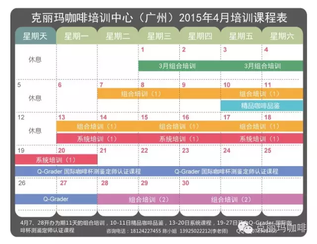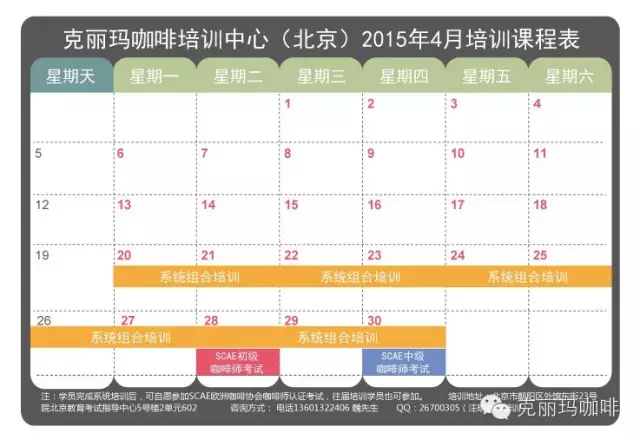 常規(guī)系統(tǒng)組合課程3月9-19日開(kāi)辦,為期11天(4800元/人)學(xué)員可只參與前8天的系統(tǒng)課程,收費(fèi)3500元/人人數(shù)限定:每班6人SCAE考試:3月17日 SCAE咖啡師初級(jí)考試3月19日 SCAE咖啡師中級(jí)考試克麗瑪咖啡培訓(xùn)中心4月課程表【北京】