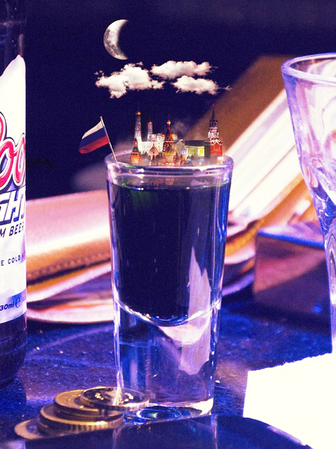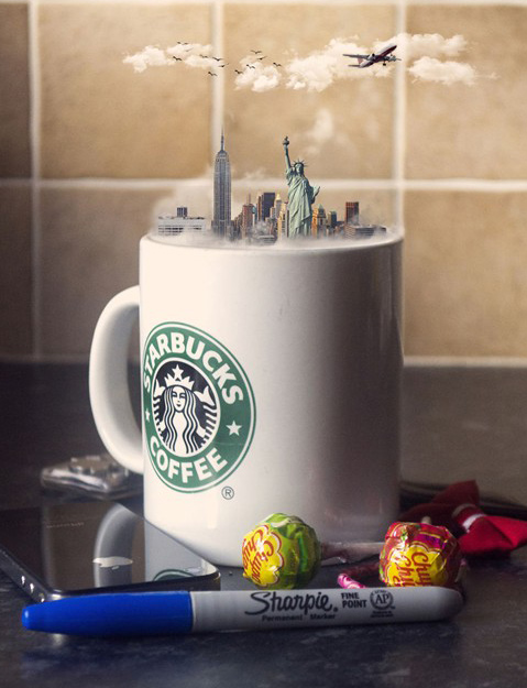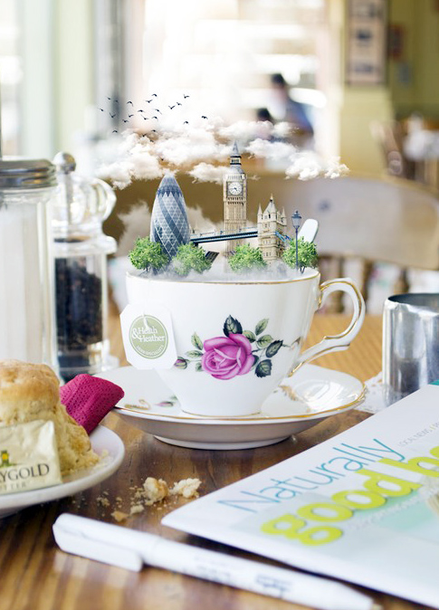 一個地方,往往會有其代表性的飲品文化,光是茶類,英國、日本、中國就有不同的茶道風格,更別說加上酒、咖啡之類的,五花八門。Jason McGroarty在視覺傳達設(shè)計師Karen McDermott的提議下,共同創(chuàng)作了名為“A Place to Go, Please”的系列作品,選取各地人們喜好的代表性飲品,并在上面放上當?shù)刂鞘械貥嗽?,以新奇的視覺效果呈現(xiàn)出各地人們與當?shù)仫嬃衔幕g的聯(lián)系。