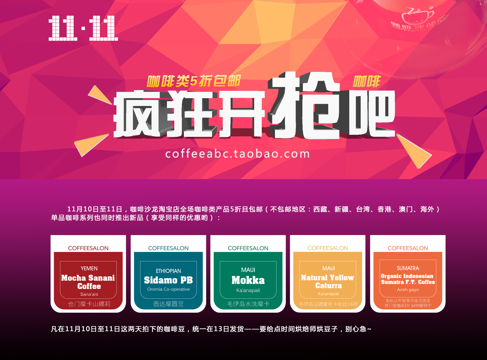 趁著大家都在為購物車瘋狂添加寶貝的時候,我們也準(zhǔn)備好一個大驚喜了!咖啡沙龍關(guān)閉商城兩年后再次推出精品自烘豆,精選十款,首批上架五款(150g/包),目的在于跟咖啡愛好者(家庭用戶)分享更多有意思的精品咖啡。降低數(shù)量門檻,方便大家多比較。11月10日至11日,咖啡沙龍?zhí)詫毜耆珗隹Х阮惍a(chǎn)品5折且包郵(不包郵地區(qū):西藏、新疆、臺灣、香港、澳門、海外)以下是打折的咖啡類產(chǎn)品: 凡在11月10日至11日這兩天拍下的咖啡豆,統(tǒng)一在11月13日發(fā)貨——要給點時間烘焙師烘豆子,別心急喲~詳情請留意我們淘寶店:咖啡沙龍網(wǎng) coffeeabc.taobao.com
