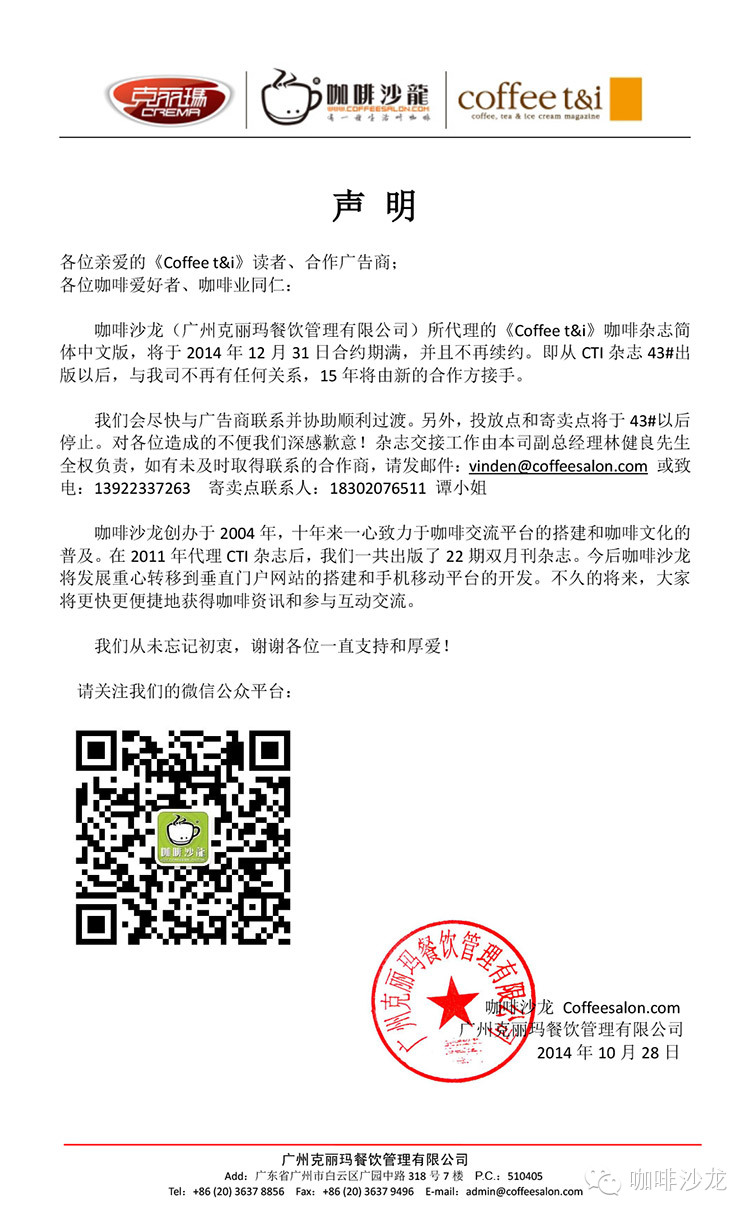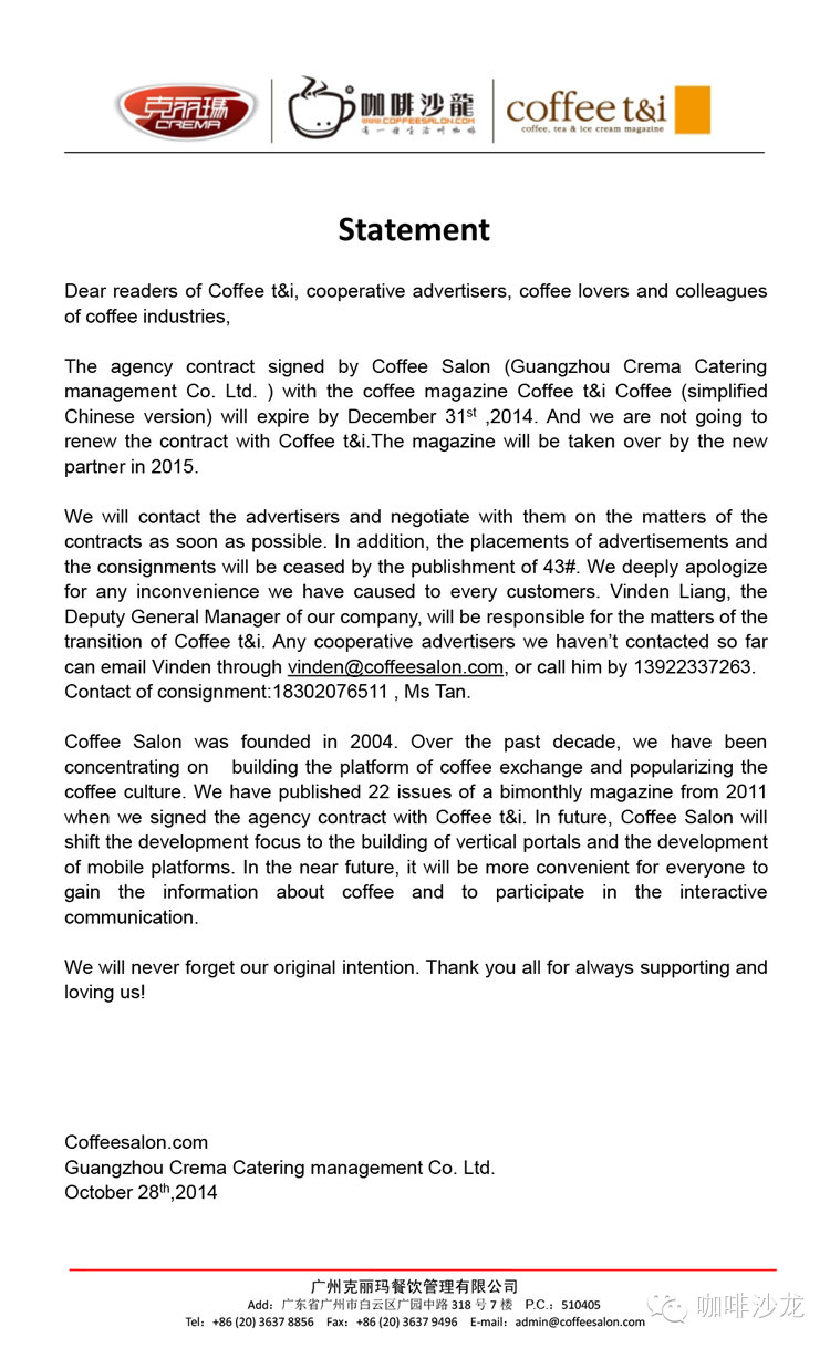 雜志交接工作由本司副總經理林健良先生全權負責,如有未及時取得聯(lián)系的合作商,請發(fā)郵件:vinden@coffeesalon.com 或致電:13922