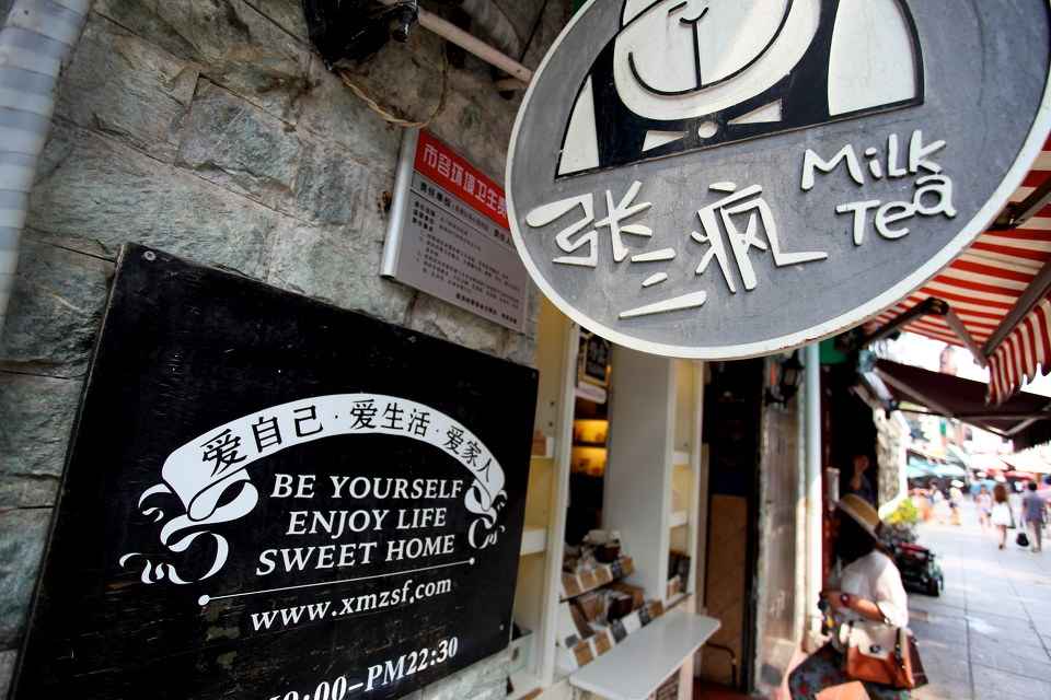 位于鼓浪嶼街心公園的張三瘋奶茶鋪店鋪狹小,藍色的墻和裝飾令人感覺很溫馨。到這里,一定要嘗嘗張三瘋招牌奶茶,一大杯歐式奶茶絕對是下午茶的首選。在廈門的生活是小資的、悠閑的、精致的,而張三瘋奶茶也延續(xù)了這種精致慢生活的精神。店內(nèi)的招牌奶茶,以歐式奶茶風(fēng)味為基底,摒棄了任何機器,純手工打造,從烹煮到茶香氤氳而出,都是出自店員之手。雀巢奶粉+斯里蘭卡進口紅茶+秘制果仁葡萄干等制造出一杯招牌奶茶。張三瘋為誰代言?要回答這個問題看一看奶茶店的周遭便可知曉。以貓為主要裝飾特色,在明信片、郵筒儲蓄罐、T恤、茶杯、茶盤、擺件上透露著張三瘋這只不尋常貓的訊息。