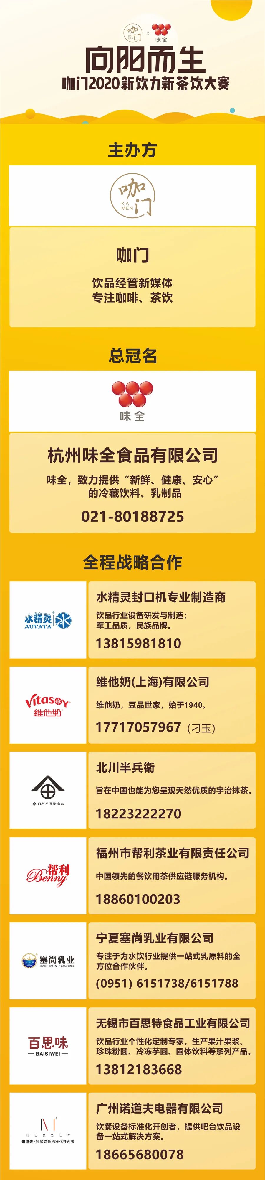 時間:8月18日地址:成都市高新區(qū)天府四街158號OCG國際中心A座4樓易上廳咖門2020新飲力新茶飲大賽,專業(yè)度全新升級。邀請行業(yè)代表品牌,組成“豪華評委顧問團(tuán)”。每一場比賽的現(xiàn)場,顧問團(tuán)導(dǎo)師都將坐鎮(zhèn)評委席,對選手表現(xiàn)進(jìn)行打分、點(diǎn)評。走到西南,還專程邀請書亦燒仙草、茶百道、一只酸奶牛等品牌的研發(fā)負(fù)責(zé)人擔(dān)任賽區(qū)評委。點(diǎn)擊文末閱讀原文鏈接或掃描圖中二維碼,來現(xiàn)場觀賽: