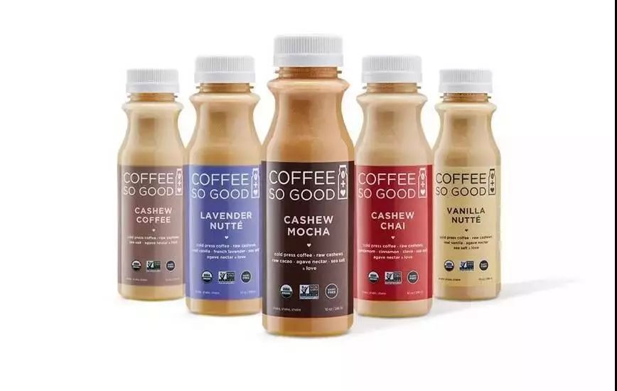 - Coffee So Good咖啡Coffee So Good咖啡是一種可以調節(jié)心情的即飲、冷壓咖啡。這款咖啡的原材料是腰果和腰果奶。一共有五種口味:原味、薰衣草味、摩卡味、臟茶味和香草味。根據(jù)Nutritional Outlook報道,Coffee So Good 的創(chuàng)始人Rita Katona介紹到:“腰果奶含有豐富的蛋白質、鐵和鎂。鎂可以幫助人緩解壓力和緊張感,并且增加多巴胺。”