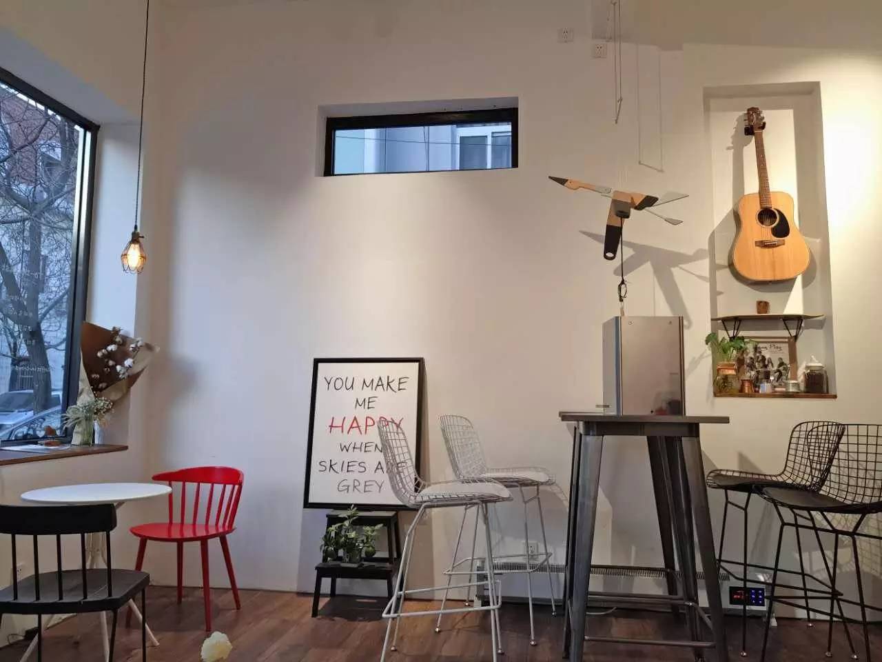 時隔兩日,我又跟著度娘找去。沿路走來,初到這家咖啡館外,就見兩人愜意的聊天抽煙,見有人來,只說您先進(jìn)屋隨意坐,詢問我是否可以等他一下,一遍道歉說今天屋里有點亂,抱歉對不起之類的話,我進(jìn)屋看見,桌椅擺放確實十分隨意。↓墻上好惹眼的吉他