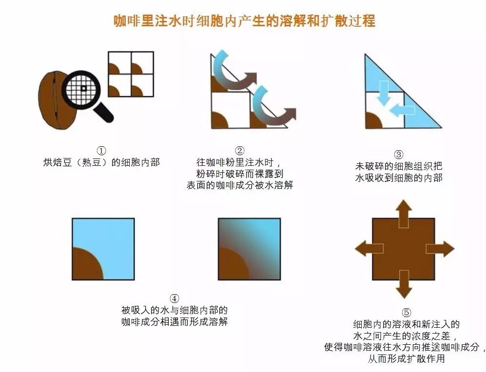 手沖咖啡的核心原理是溶解和擴(kuò)散在烘焙過(guò)程中,咖啡細(xì)胞內(nèi)部發(fā)生化學(xué)反應(yīng),生成散發(fā)出咖啡香氣和味道的多種成分。作為這些化學(xué)反應(yīng)的副產(chǎn)物,咖啡內(nèi)部慢慢形成的氣體,使細(xì)胞開(kāi)始 膨脹。這些氣體和水分通過(guò)細(xì)胞內(nèi)部非常小的細(xì)孔往外排出。這些不計(jì)其數(shù)的細(xì)孔中含有烘焙過(guò)程中形成的主導(dǎo)咖啡味道的成分。要想溶解這些成分,首先要粉碎咖啡豆,而且盡可能地把咖啡豆細(xì)胞組織內(nèi)部的細(xì)孔多裸露到表面。然后慢慢注水,就能溶化出咖啡的成分,這就是溶解。為了順利進(jìn)行溶解,我們可以考慮把咖啡粉磨到最細(xì),使細(xì)胞內(nèi)的所有成分得到溶解。但是磨得太細(xì)就容易堵住濾紙,所以實(shí)際萃取時(shí)咖啡粉只磨成芝麻粒大小。這樣有一些含有咖啡成分的細(xì)胞被裸露到表面,也有一些細(xì)胞未露出表面。還有一些含有咖啡成分的細(xì)胞通過(guò)粉碎也不能破碎,這種細(xì)胞無(wú)法通過(guò)溶解來(lái)萃取,這時(shí)只能通過(guò)擴(kuò)散才形成萃取??Х妊b入濾杯里,先少量注水至咖啡浸透,咖啡就開(kāi)始膨脹。這是因?yàn)闊崴樦姹哼^(guò)程中形成的咖啡細(xì)胞之間的毛細(xì)管,浸入到咖啡細(xì)胞內(nèi)的同時(shí),把細(xì)胞內(nèi)的氣體往外推擠出來(lái),使得咖啡膨脹。進(jìn)入到咖啡細(xì)胞內(nèi)的水,開(kāi)始溶解咖啡成分從而形成了濃厚的咖啡溶液。靜置一會(huì)兒再次往濾杯內(nèi)注水,這時(shí)咖啡細(xì)胞內(nèi)形成的溶液和新注入的水之間產(chǎn)生濃度之差,濃濃的咖啡溶液就開(kāi)始往新注入的水中推送咖啡成分,這種過(guò)程就是擴(kuò)散。就這樣,為了更順利地進(jìn)行溶解,以及充分形成以濃度之差引起的擴(kuò)散,正式萃取之前往咖啡細(xì)胞內(nèi)第一次注水之后靜置30~40秒的過(guò)程叫作事前萃?。ㄒ步袗炚簦?。在這個(gè)過(guò)程中,咖啡已充分形成萃取準(zhǔn)備。