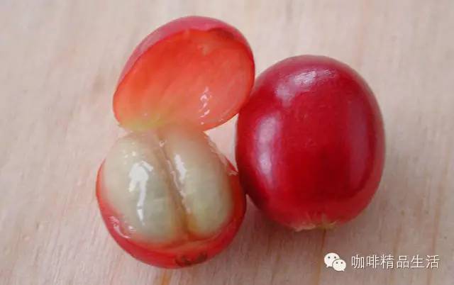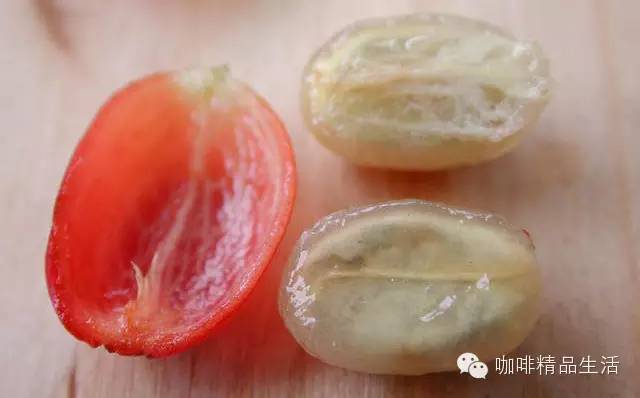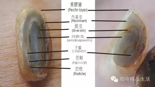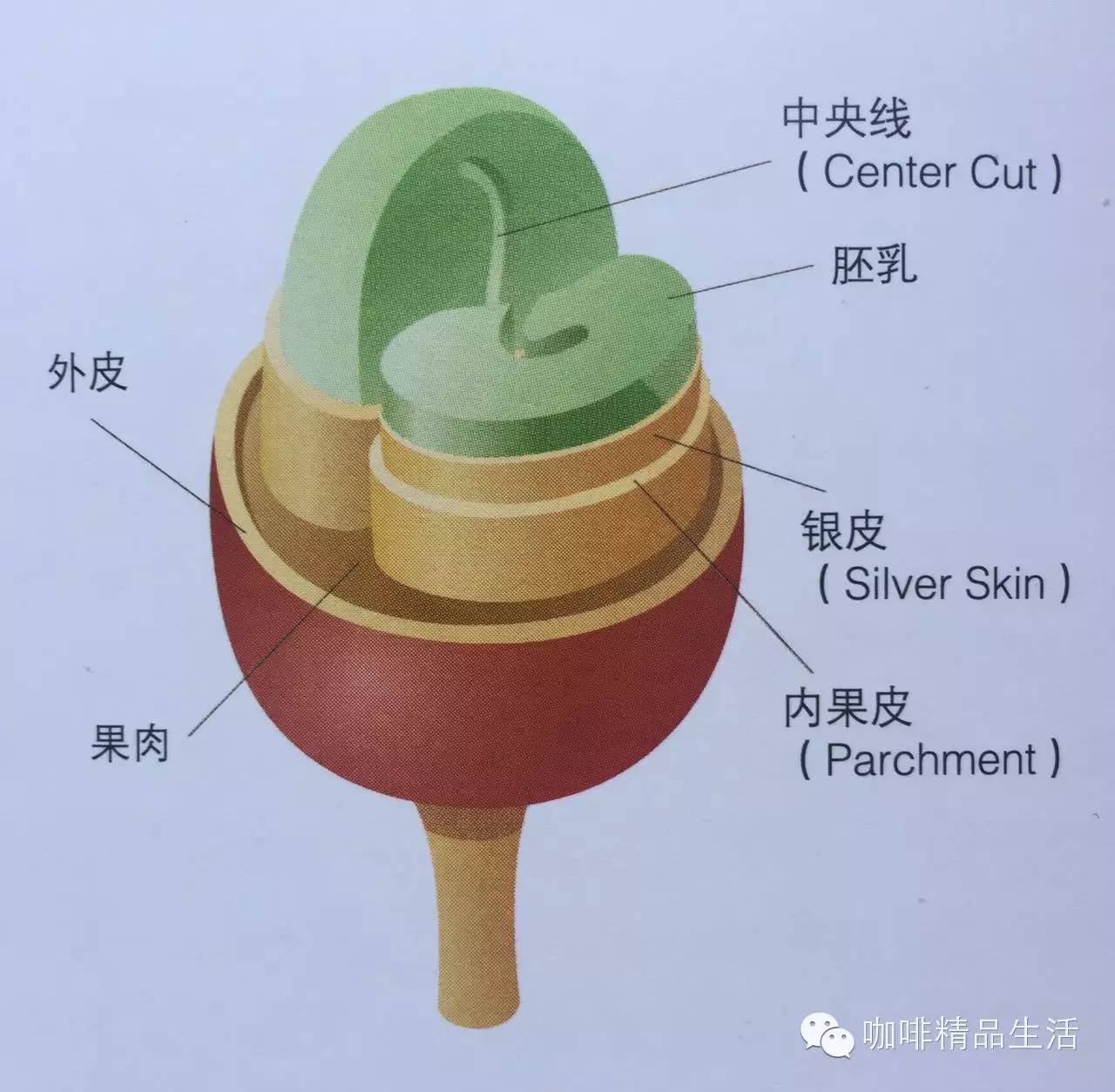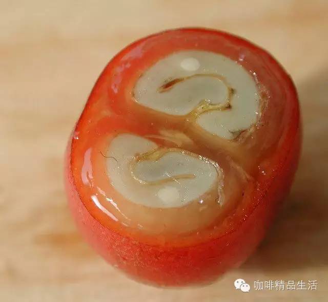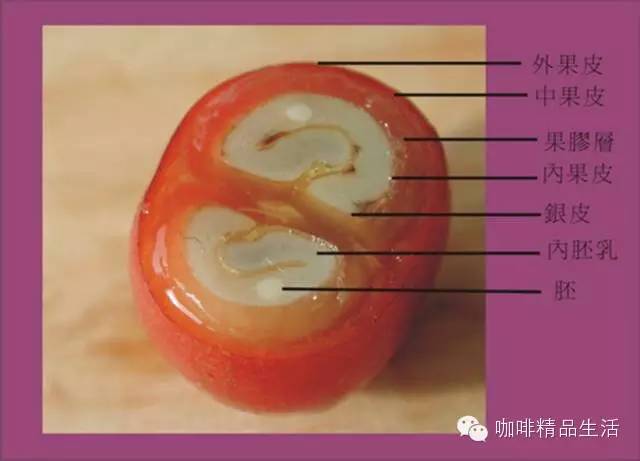 華麗麗的咖啡果(咖啡櫻桃)解剖圖,帶你進入咖啡的精品“內(nèi)心”世界。撥開完全成熟的鮮紅咖啡果實外皮來看,可以看到在紅色外皮