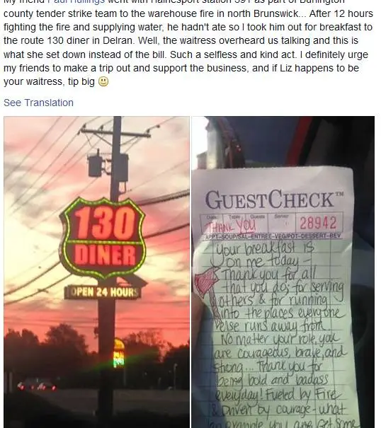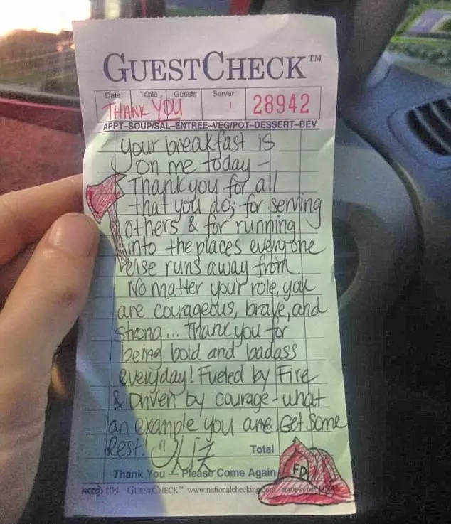 紙條上的字,恰如熱咖啡溫暖了兩名消防員,在火海中不曾退縮的兩個大男人忍不住酸了鼻子。而看到這一幕的Woodward姑娘,也暖暖地笑了?!叭ミ@家餐廳吧,見到這位好姑娘,多給她小費”——揮手作別后,回到家的消防員將這次經(jīng)歷發(fā)表在臉書上,向朋友推薦這家餐廳作為對善良姑娘Woodward的報答。要知道,消防員在美國可是最受尊敬的職業(yè)之一,這一消息很快不脛而走,被大量轉(zhuǎn)發(fā)。