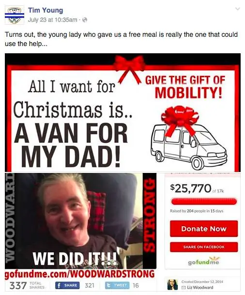 就在大家對Woodward的贊美中,消防員Tim Young無意間發(fā)現(xiàn)了Woodward更多的故事——從2010年起,Woodward的父親Steve因為腦動脈瘤臥病在床至今,急需一輛可供輪椅上下的汽車,除了自己辛勤打工之外,Woodward還為父親在一家募捐網(wǎng)站上籌集善款。