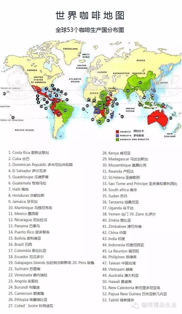 點(diǎn)擊查看大圖,好東西,樂分享。全球53個(gè)咖啡生產(chǎn)國分布圖,顏色表示該國咖啡的主要品種。全球咖啡種植集中在北緯25度到南緯30度這一帶狀區(qū)域,原因是咖啡樹非常容易受到霜害,緯度偏北或偏南都不適宜,這個(gè)帶狀區(qū)域也被成為“咖啡帶”(coffee zone)。點(diǎn)擊“閱讀原文”,看“世界咖啡產(chǎn)區(qū)知識(shí)大全”