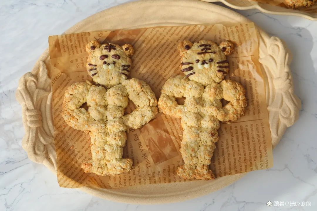 備年貨啦!本來這款餅干準(zhǔn)備起名叫“?;ⅰ钡?,但做的這么強(qiáng)壯,叫“?;⑸卑晒?!福虎吃起來也毫不含糊哈哈!單獨(dú)做一些可可愛愛的小老虎,也適合馬上到來的虎年呀~圖案建議和小朋友一起DIY,畫小老虎可好玩兒了!酥酥脆脆越嚼越香的燕麥餅干,有營養(yǎng),糖份也很低,健健康康的配方碼住哦!福虎聲威燕麥餅干配方1份方子里配圖是兩份黃油(融化)70g140g細(xì)砂糖40g80g全蛋液50g(約一個)100g(約2個)泡打粉1g2g低筋面粉100g200g燕麥片90g180g牛奶10g20g裝飾黑白巧克力適量適量①黃油融化,除裝飾材料外,全部材料混合稱量。②抓拌勻,可以根據(jù)需求適當(dāng)調(diào)節(jié)軟硬度,到這樣能抓成團(tuán)不會輕易松散的程度即可。③塑形部分,小老虎的頭就是一個大圓球按扁,兩邊小小的兩個小球球按扁做耳朵。④“壯虎”肌肉紋路注意做出溝壑哈哈!⑤平爐模式,180度上下火20分鐘。烘烤到邊緣微微金黃色即可,烘烤完也能較好的保持原來的形狀,不會松散。非常強(qiáng)壯的小老虎沒錯了哈哈!最后畫臉部細(xì)節(jié)就可以啦,一個個的可可愛愛!虎虎生威~如果有其他疑問請?jiān)谙路搅粞越o我們看到后一定盡力回復(fù)大家?(^?^*)
