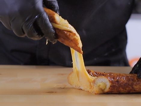 雖說有些夾心餡料的設(shè)計(jì)不一定能直接看到,但是隱藏在面包皮內(nèi)的驚喜感以及制作的工藝與巧妙的構(gòu)思,都是面包師傅們的匠心所在。從最開始的果醬、卡仕達(dá)醬夾心,到后來的芝士流心面包、抹茶芝士風(fēng)味、酸奶風(fēng)味等,又或是拉絲、爆漿的餡料,都是適應(yīng)了時(shí)下流行的元素以及目標(biāo)將口感體驗(yàn)發(fā)揮到極致的創(chuàng)作。那么,周斌師傅作為一名一直奮戰(zhàn)在門店前線的研發(fā)人員,他帶來的創(chuàng)意性的爆款?yuàn)A心餡料又會(huì)是什么樣的呢?很簡(jiǎn)單,以基礎(chǔ)款為本體進(jìn)行升級(jí)!Part 01“爆漿臟臟包”——布里歐長(zhǎng)笛“臟臟包”,可謂一時(shí)之選的佳品。所以,此后的好多產(chǎn)品都設(shè)法想要與“臟”搭上點(diǎn)關(guān)系。這款產(chǎn)品正是延續(xù)了“臟”屬性的流行熱點(diǎn),“凡吃過必留下痕跡”,再配以肉眼可見的滿滿爆漿餡料,創(chuàng)作而出。