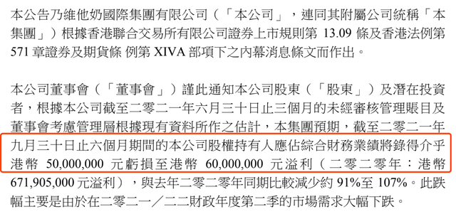 05.維他奶發(fā)布盈利預(yù)警,預(yù)計(jì)截止2021年9月30日的六個(gè)月內(nèi),公司經(jīng)營利潤將介乎虧損5000萬元至盈利6000萬元之間,較去年2020年同期減少約91%至107%。公告內(nèi)容稱,一份包含不恰當(dāng)內(nèi)容而且未經(jīng)授權(quán)的內(nèi)部備忘錄在社交平臺(tái)被廣泛流傳,導(dǎo)致中國內(nèi)地消費(fèi)者對(duì)集團(tuán)構(gòu)成負(fù)面影響,以致整個(gè)七月份內(nèi)中國內(nèi)地不同銷售渠道均發(fā)生產(chǎn)品下架的情況。