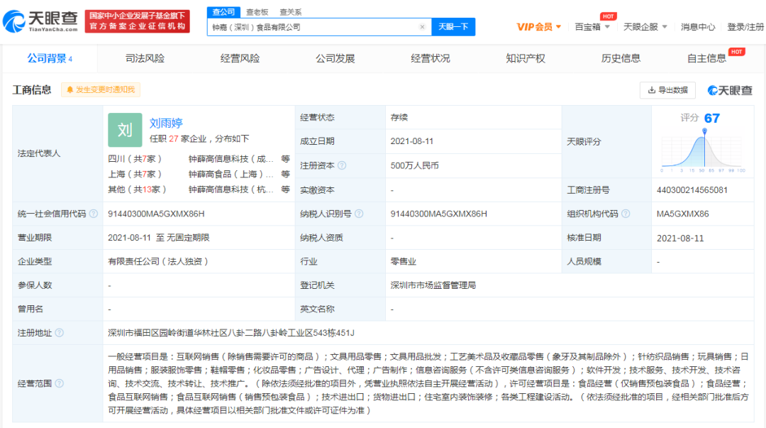 09.8月11日,鐘薛高在深圳成立鐘嘉(深圳)食品有限公司,注冊(cè)資本500萬人民幣,法定代表人為劉雨婷,經(jīng)營范圍包括互聯(lián)網(wǎng)銷售、食品經(jīng)營、食品互聯(lián)網(wǎng)銷售等。股東信息顯示,該公司由鐘薛高食品(上海)有限公司全資控股。