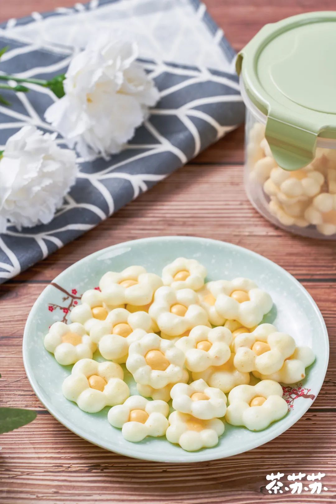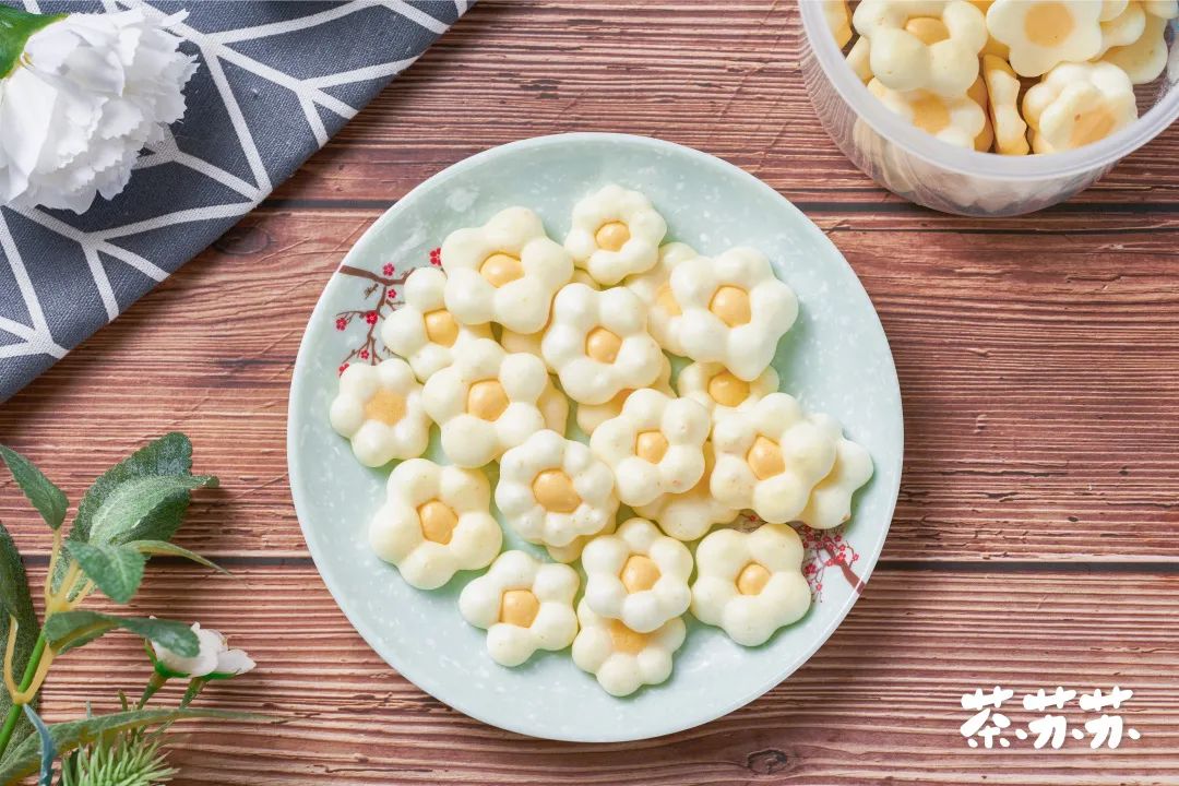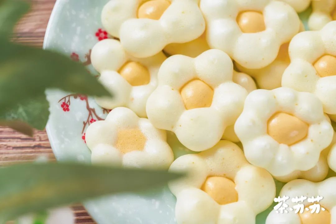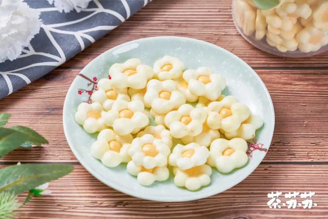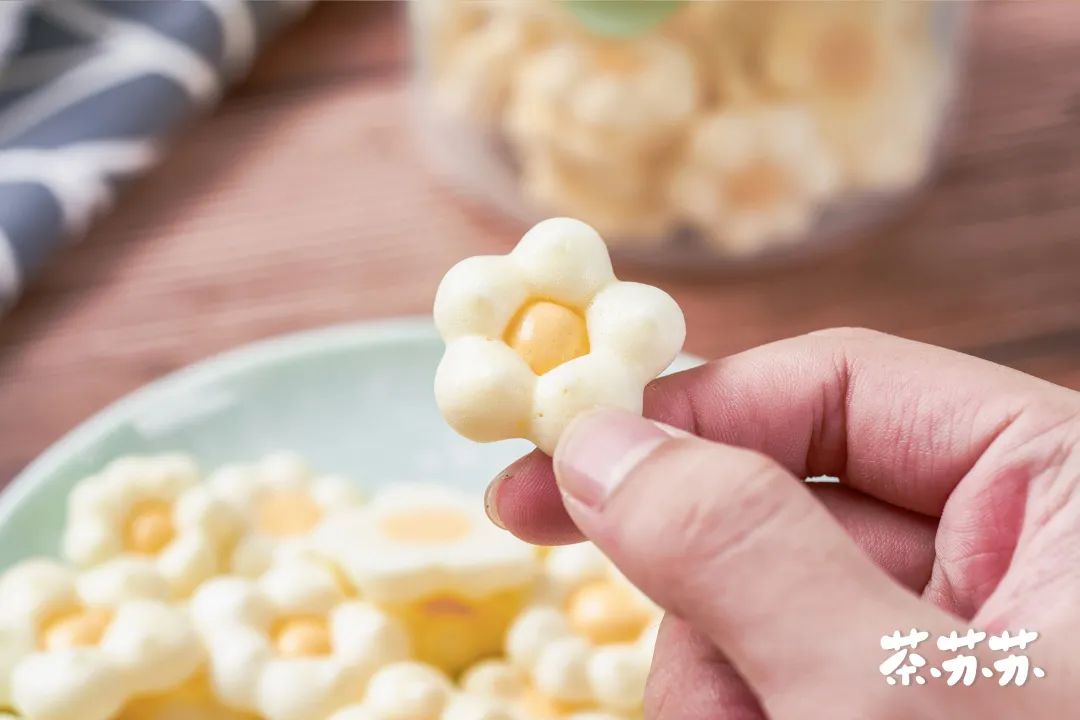 蛋黃色的花心配上白色的花瓣,看上去真是童趣滿滿,小小一顆拿在手上,是餅干的那種手感。送一顆進嘴里,咬起來明明酥脆,含一下卻立馬融化,雞蛋和奶粉的味道,完美地融合在一起,吃了之后我才明白,為何小朋友們會百吃不厭了~