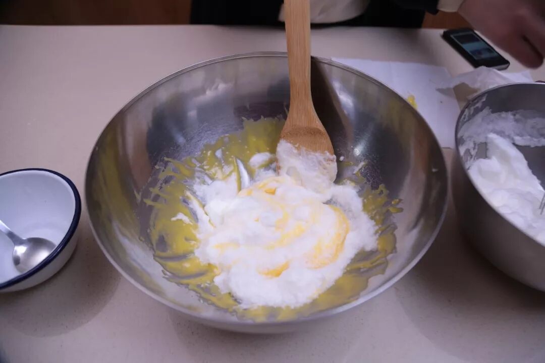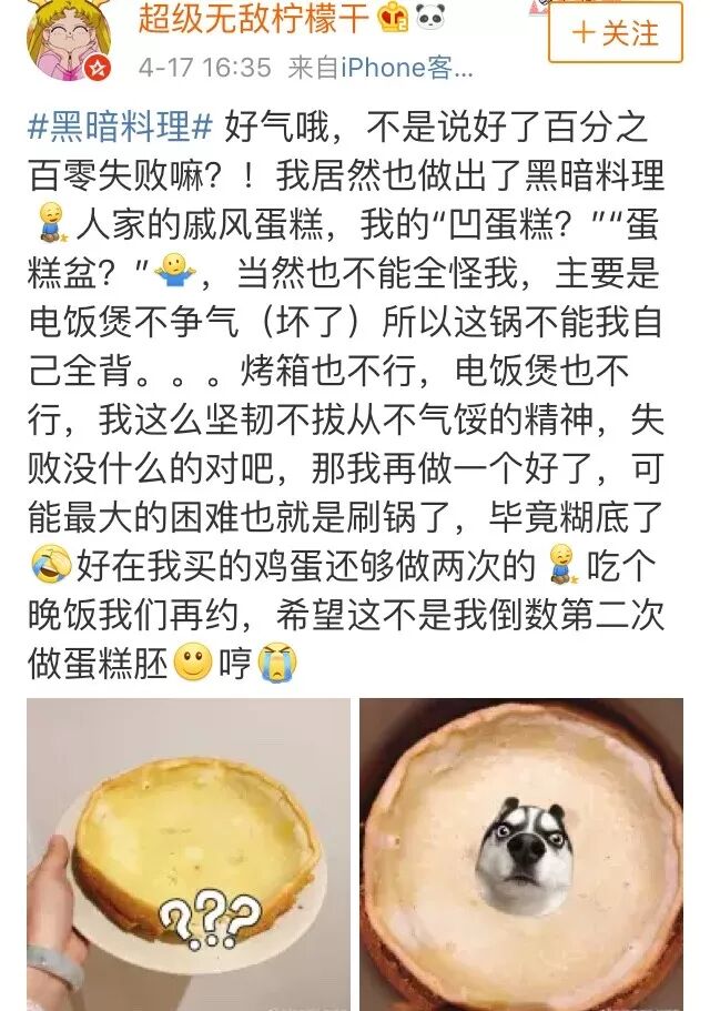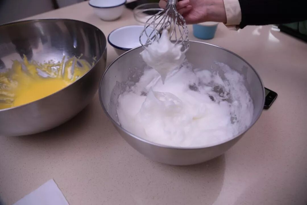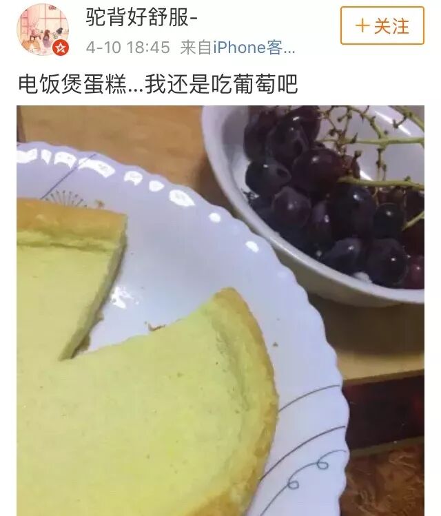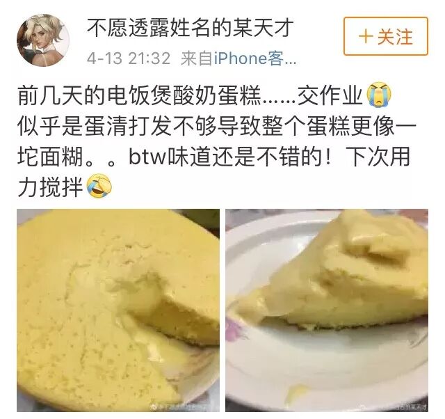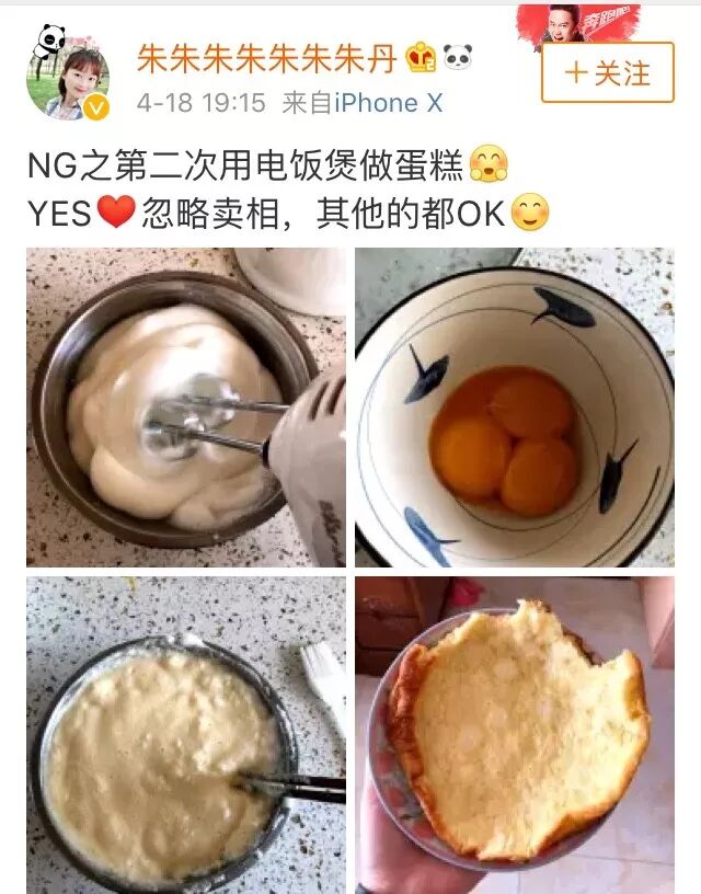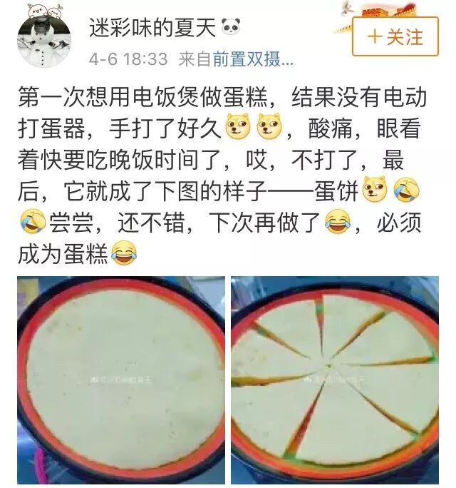 如果隨機采訪烘焙愛好者“大家做的第一款甜品是什么?”可能有接近一半的人會回答”電飯煲蛋糕“畢竟連烤箱都不用確實適合作為入門首選嘛!好奇如我十分想知道大家做出來到底啥樣于是去微博上搜了一下...結(jié)果大家的圖片之精彩讓我覺得不跟大家分享都不合適...看完大家的作品我只想稱贊一句:大家做出的蛋餅都不錯哦...那終極問題來了電飯煲到底能不能做出蛋糕?電飯煲蛋糕好不好吃?我們?yōu)榱颂骄壳宄@個問題派出了萬能的人事小姐姐給她的任務(wù)是去馬路上邀請一位沒有烘焙經(jīng)驗的小白來i烘焙實驗室做一個電飯煲蛋糕她果然沒有辜負我們的期望成功邀請來一位可愛的小姐姐?。ㄠ??說好的小哥哥呢?)小姐姐如約來到了i 烘焙實驗室材料我們已經(jīng)為她準(zhǔn)備好啦!至于配方則讓小姐姐自己在網(wǎng)上選個看著靠譜的小姐姐選了個6000多人做過的配方配料如下:雞蛋 4個低筋面粉 100g玉米油 50ml牛奶 45ml白糖 70g檸檬汁 幾滴(制作步驟其實就是戚風(fēng)蛋糕的步驟就不貼過來給大家看了)所有的原料工具如圖一定有眼尖的小伙伴發(fā)現(xiàn)了圖中沒有廚房電子秤也沒有電動打蛋器甚至連刮刀都沒有...沒錯!這次電飯煲蛋糕挑戰(zhàn)我們?yōu)榱诉€原真實情況基本沒有配任何烘焙專業(yè)工具只給了小姐姐一個蛋抽(實在舍不得看她拿一把筷子打發(fā)蛋清)電子秤替代品:已知容量150ml的小碗電動打蛋器替代品:手+蛋抽刮刀替代品:木制飯鏟~~~都準(zhǔn)備好啦!我們開始吧!~~~準(zhǔn)備工作:稱量材料小姐姐的稱量工具只有一個150ml小碗用來稱量所有的原料不做烘焙的人對烘焙原料的份量沒有概念小姐姐下手特別輕我在旁邊看得膽戰(zhàn)心驚...稱量完畢之后我偷偷秤了她的實際原料重量(括號內(nèi)為配方的量)雞蛋 4個低筋面粉 70g(100g)玉米油 28ml(50ml)牛奶 30ml (45ml)糖 25g (70g)檸檬汁 無需稱量沒有秤的情況下果然根本無法大概估算原料的量尤其烘焙新手還對原料的份量不熟第一步:分蛋為了避免小姐姐無法打發(fā)蛋白我們還是提前告訴了她最基礎(chǔ)的常識:蛋白一旦接觸蛋黃就無法打發(fā)于是小姐姐全程分蛋都十分小心翼翼像這樣:沒錯分蛋全靠抖...抖了好一會不過這樣分的蛋確實很干凈蛋白沒有被蛋黃“污染”第二步:蛋黃中加糖攪勻配方里這一步是這樣寫的:“用這種普通的湯匙從稱好的白糖中舀兩勺放進打散的蛋黃中攪拌均勻打到微微發(fā)白”于是小姐姐按照配方舀了兩勺糖...因為本來稱量的糖只有25g所以盛出2勺之后基本就剩下一個碗底了...因為小姐姐選了一個很小的碗裝蛋黃所以用蛋抽攪拌起來顯得有點擠第三步:分別加入牛奶、油攪勻小姐姐終于意識到這個攪拌碗太小把蛋黃液倒入了大攪拌盆然后分別加入了牛奶和油攪勻第四步:過篩面粉然后加入蛋黃糊攪勻小姐姐是個講究人即使沒有粉篩也用木鏟先將面粉里的結(jié)塊拌散然后按照配方“用刮刀攪拌”想用木鏟把面粉跟蛋黃糊混勻真是太難了...小姐姐的動作看起來有點無措木鏟拌了一會還是有非常多干粉小姐姐忍無可忍拿起了蛋抽開始使勁畫圈中途又看配方確認了一下作者居然說不能畫圈否則會起筋于是改為四面八方攪拌了一會終于攪勻了第五步:手動打發(fā)蛋白終于到了最激動人心的環(huán)節(jié)!!設(shè)好計時器!開始!看起來文質(zhì)彬彬的小姐姐左手托起攪拌盆右手開始使勁畫圈初步打散蛋白后加入糖繼續(xù)攪拌已經(jīng)開始起白泡沫了小姐姐全程用左手端著打蛋盆看起來手臂酸得不行我跟她說放桌子上比較省力氣小姐姐委婉地拒絕了我“放桌子上我使不上勁兒...”果然手動打發(fā)蛋白這種事實在是太消磨意志...小姐姐不停地在換姿勢看起來胳膊也開始有些吃力了終于!在計時器接近八分鐘的時候小姐姐停了下來說自己覺得已經(jīng)打發(fā)了然后不好意思地一笑好像有點打過了...這也證明了手動打發(fā)蛋白是可行的盆里有4個蛋白小姐姐只用了8分鐘就打發(fā)(guo)了當(dāng)然這有個前提蛋白沒沾水也沒沾油是能夠打發(fā)的狀態(tài)否則打半小時也沒用...第六步:鍋內(nèi)涂油 預(yù)熱電飯煲配方作者讓在鍋底涂上油方便等會脫模油倒進去了可是怎么涂均勻呢...只見小姐姐把電飯煲內(nèi)膽取下開始一陣猛抖猛晃鍋底的油大致抖均勻后放回電飯煲點擊熱飯功能提前進行預(yù)熱第七步:拌勻蛋黃糊和蛋白霜小姐姐先取了1/3的蛋白加入蛋黃糊企圖用木鏟攪勻但是因為木鏟太硬混合效率極低小姐姐決定接下來用蛋抽來混合蛋抽果然效率高!一會就混合好了!第八步:面糊倒入電飯煲調(diào)至蛋糕/加熱模式?jīng)]有刮刀的小姐姐只能用蛋抽來倒面糊...調(diào)至“蛋糕”模式開始烤蛋糕啦!第九步:取出蛋糕晾涼大概40分鐘后是我們打開電飯煲一看邊上已經(jīng)是金黃色明顯已經(jīng)烤好啦!沒糊真是太好了!(聽說很多小伙伴的電飯煲蛋糕底都是黑的...)借助木鏟將蛋糕取出好燙好燙!鏘鏘!電飯煲蛋糕做好啦!看起來顏色還不錯!但是很薄形狀像馕、大餅之類的主食切開來看組織相當(dāng)扎實基本上跟布丁差不多吃起來的口感也是非常實在的甜味蛋餅質(zhì)感上跟北方常見的糊塌子差不多至于好不好吃嘛...小姐姐和辦公室所有的小伙伴都是出于好奇嘗一口就沒有人愿意再碰它了...咳咳我們擺個造型!是不是