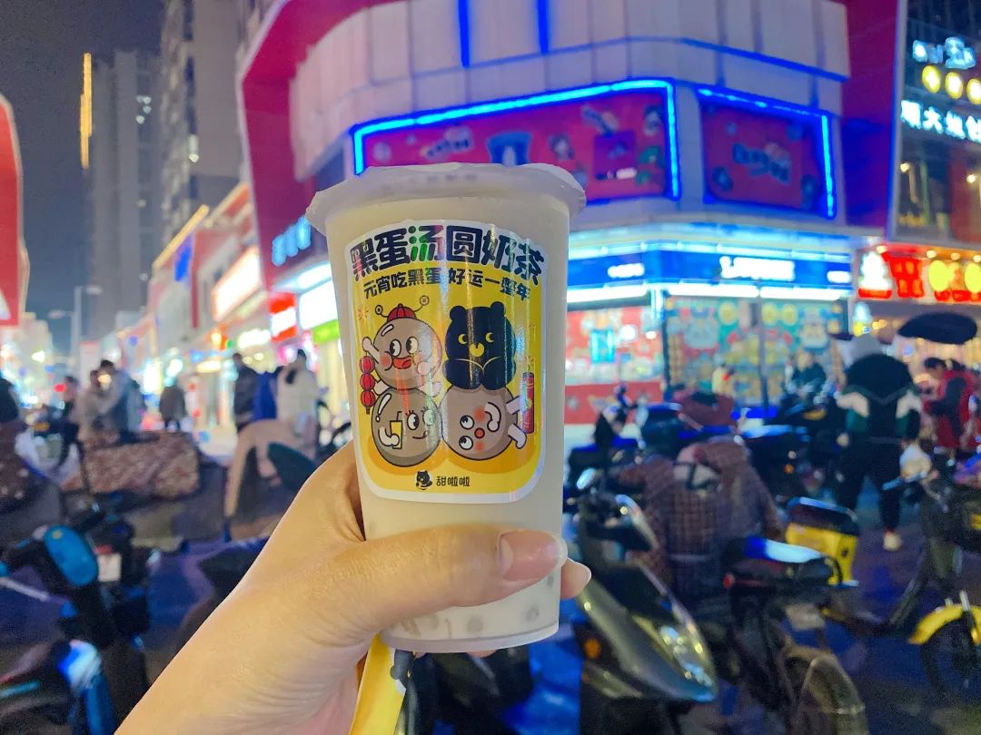 從IP角度分析,相比于蜜蜂,熊的形象曾經(jīng)出過很多爆款,比如熊本熊、布朗熊、熊大熊二等,以熊作為品牌符號,與消費(fèi)者進(jìn)行情感鏈接,辨識度更高。- 物料、文案處處有心機(jī),提升效率元宵節(jié)期間,甜啦啦每家店吧臺上,都有一個橫幅“元宵吃黑蛋,好運(yùn)一整年”,推薦的是一款以熊黑蛋命名的湯圓奶茶,這種類似諺語的產(chǎn)品口號,能促進(jìn)顧客做出進(jìn)店決策。顧客點(diǎn)單時,菜單上方文案“90%土豪加了1元椰果,剩下的10%加了2元”畫風(fēng)俏皮,又能輕松提升1~2元客單價。