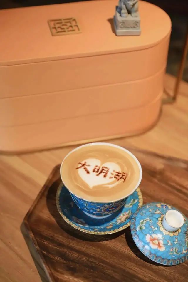 濟(jì)南大明湖南豐戲樓內(nèi)的咖啡館,古樸的琺瑯茶杯內(nèi)盛上西式的咖啡拿鐵,用“大明湖”三個(gè)大字拉花,將中式與西洋結(jié)合。