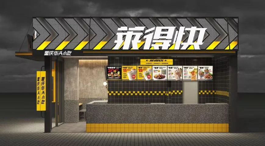 萊得快的店面與傳統(tǒng)酸辣粉店的江湖、市井氣息不同,借鑒了西式快餐店的風(fēng)格,同時(shí)融入城市元素,自成一套視覺(jué)派系。比如街頭文化、勒是霧都,這些在抖音、說(shuō)唱中常見(jiàn)的潮流符號(hào)。