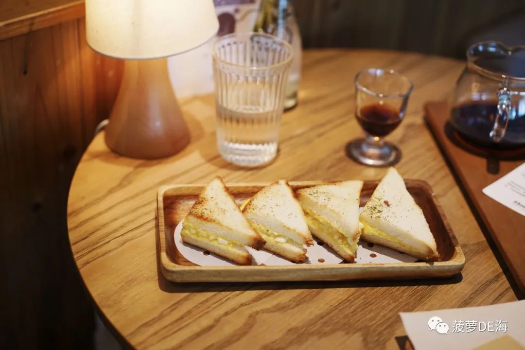 現(xiàn)烤松餅古早口味,香,甜,用手抓著蘸奶油,無(wú)意識(shí)地送進(jìn)嘴里最好,再配杯加滿了冰的中深烘焙美式咖啡。蛋泥三明治切去吐司邊,烤脆,抹上雞蛋沙拉,表面撒干百里香,點(diǎn)睛之筆。桌上這些食物與窗外梧桐樹,時(shí)常讓我錯(cuò)覺抽離現(xiàn)實(shí),仿佛出門那一瞬,時(shí)間才會(huì)開始流淌。