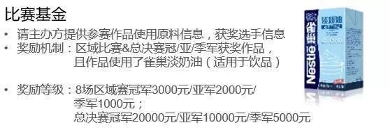 為鼓勵(lì)選手積極性,雀巢中國(guó)近日向飲品大賽組委會(huì)表示,選手若在區(qū)域比賽作品中使用到由雀巢提供的飲品專(zhuān)用奶油,并獲得冠亞季軍,分別予以3000元、2000元、1000元的現(xiàn)金獎(jiǎng)勵(lì)。