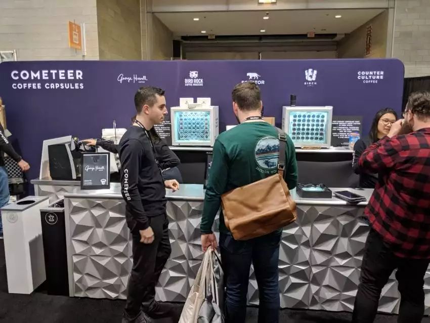 Cometeer在博覽會上的展位。圖片來源:NicholasYamada Cometeer今年首次參加了此次博覽會。這家年輕的公司以膠囊形式提供咖啡。營銷副總裁ZacharyRueda告訴我“長期以來人們?yōu)榱朔奖愣鵂奚速|(zhì)量?!甭?lián)合創(chuàng)始人兼首席執(zhí)行官MatthewRoberts強調(diào)可持續(xù)性的重要性,并告訴我“因為我們的膠囊內(nèi)部有冷凍液體能夠沖洗干凈,這使它們變得100%可回收?!啊 tetepedCoffee和Cometeer都在博覽會上獲獎-前者為BestPackaging,后者為OpenClass。