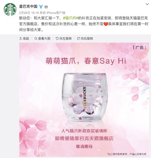 一個貓爪引發(fā)的血案,星巴克貓爪杯走紅上千元一個!2月26日,星巴克咖啡在中國門店發(fā)售了2019年的櫻花主題系列的杯子,在星巴克的這組春季新品中,不少杯子的造型、設(shè)計都離不開貓、狗和櫻花,而在這些新款杯子中,最受歡迎的當(dāng)屬一款名為“貓爪杯”的杯子。這只杯子之所以受歡迎是因?yàn)楸拥膬?nèi)壁被做成了貓爪子的樣子,當(dāng)帶有顏色的飲料注入杯子后,貓爪會隨著飲料“實(shí)體化”變的更加清晰。這款“貓爪杯”在上市之前就在微博和抖音瘋狂刷屏而走紅,發(fā)售信息一出現(xiàn)就立刻傳遍了全網(wǎng),一經(jīng)開售即被一搶而空。