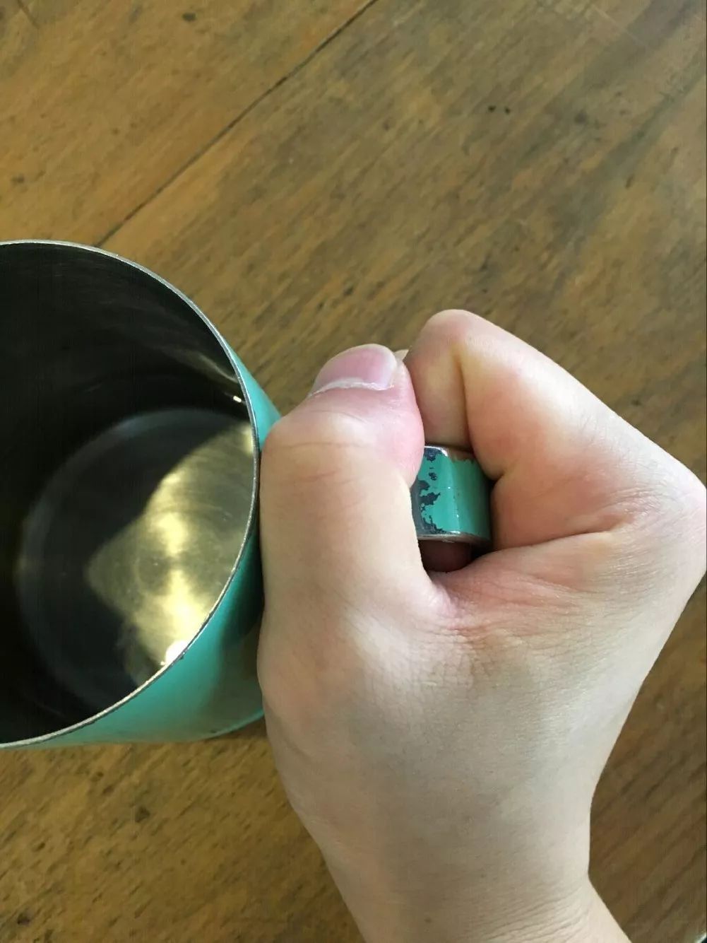 而拉花缸的握法常見的有兩種:一種是握著拉花缸的把手,另一種則是捏著拉花缸的把手。