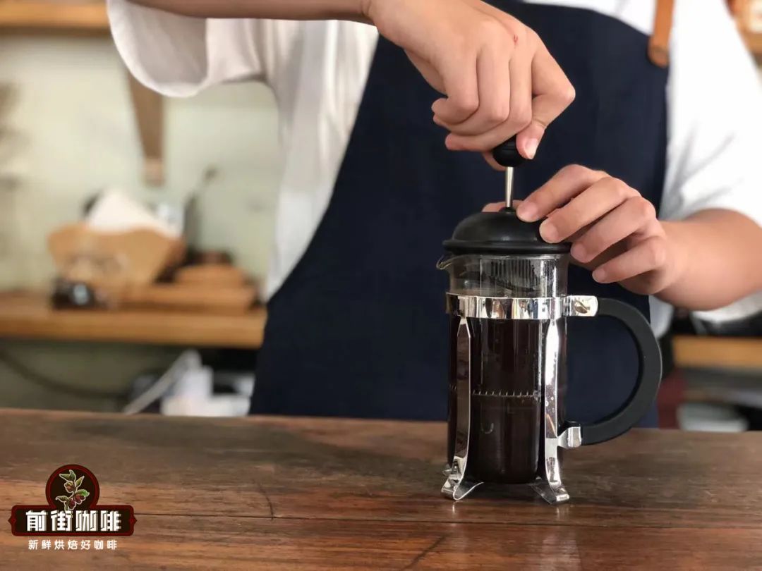 沖煮粉量為15g,粉水比例為1:15,即我們需要15g咖啡粉注入225g熱水進(jìn)行萃取。先把聰明杯移到電子秤處(此時(shí)閥門會(huì)自動(dòng)關(guān)閉),往濾杯中央倒入研磨好的咖啡。按下計(jì)時(shí)器,第一段以“Z”型注入30g的熱水進(jìn)行悶蒸30秒。悶蒸后不用繞圈,在濾杯中心細(xì)水流注入熱水至225g,然后浸泡1'50"。泡完成后將聰明杯移到容器上打開閥門,過濾出濾杯中咖啡液,整個(gè)過程時(shí)長大約15秒,咖啡的總萃取時(shí)間為2'05"。法壓壺浸泡萃取風(fēng)味表現(xiàn):混合莓果般的香氣,復(fù)合果汁感,明顯奶油般的口感,整體飽滿醇厚。法壓壺由耐熱玻璃容器與帶壓桿的金屬濾網(wǎng)組成,主要靠浸泡的方式萃取咖啡。在萃取過程中浸泡時(shí)間越久,咖啡被萃取出的物質(zhì)越多直至飽和,也就是說泡得越久咖啡越濃。同時(shí)金屬濾網(wǎng)的過濾會(huì)保留咖啡中大量的油脂,咖啡口感更佳順滑,但因?yàn)闊o法完全過濾細(xì)粉出現(xiàn)微渣感。為了避免萃取過度,前街建議研磨度采用中粗研磨(中國20號(hào)篩網(wǎng)過篩率71%),水溫建議采用92攝氏度,浸泡時(shí)間4分鐘。