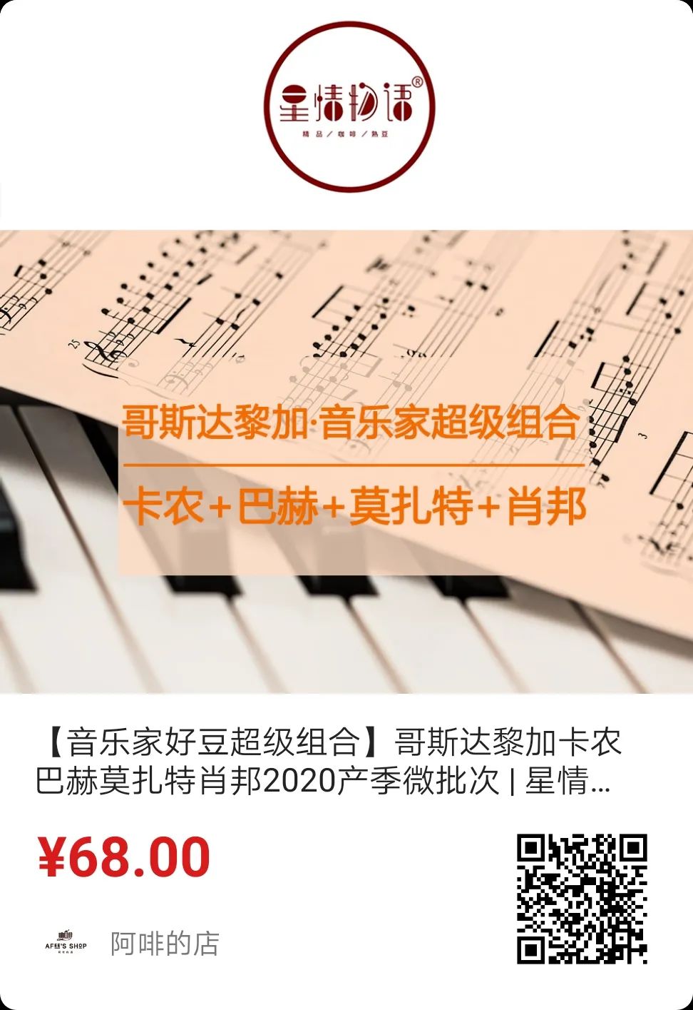 #超級特價組合#卡農(nóng)100克+巴赫100克+莫扎特100克+肖邦100克,原價272元,組合特價218元,平均1包不到55元,喜歡這系列豆的速度帶走!4包豆子也允許自由組合,請下單時備注下。(如2包卡農(nóng),2包莫扎特,同樣享受組合特價218元)