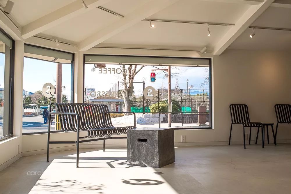 這間咖啡館設(shè)計(jì)十分有特色。 外觀融合了日式石造庭園的幽靜,內(nèi)部則是十分現(xiàn)代的水泥寬敞設(shè)計(jì)。